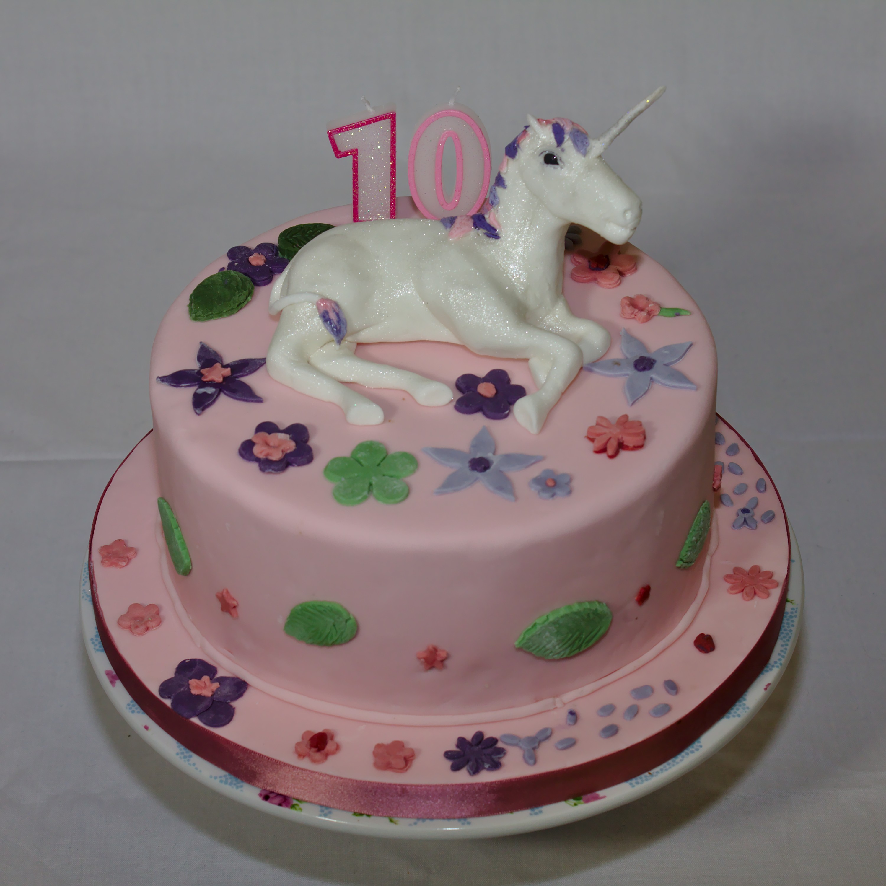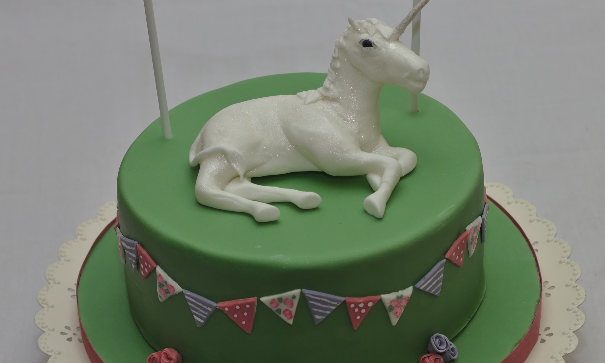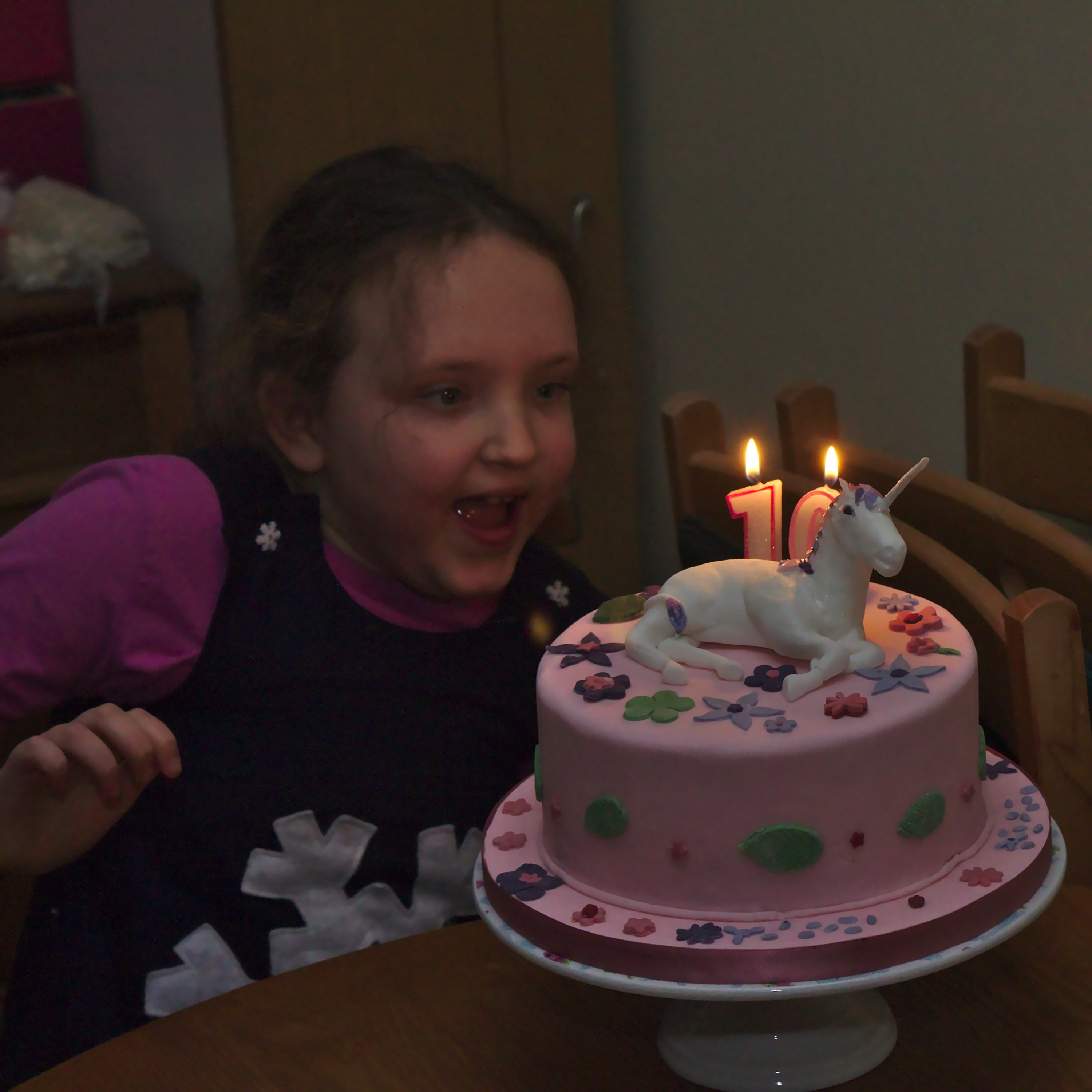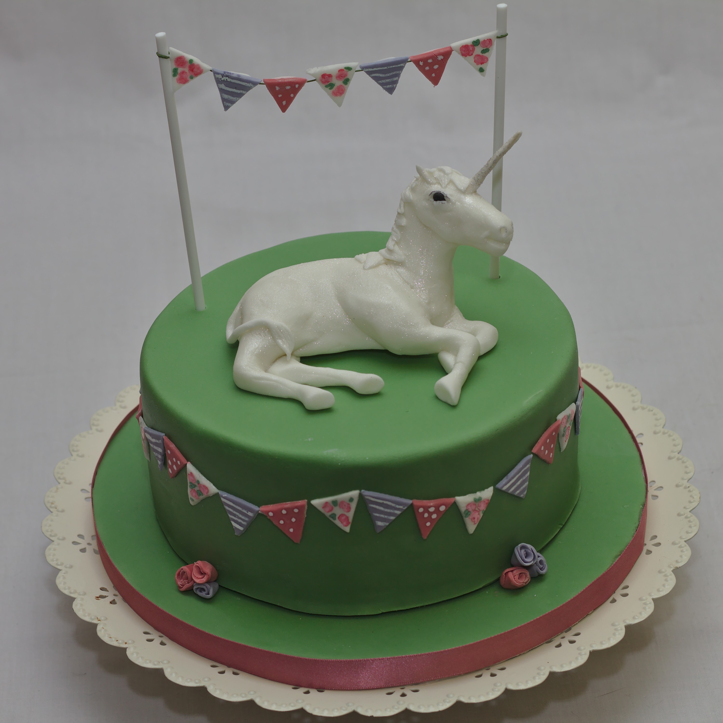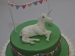 For Kirsty’s 10th Birthday I made two cakes – one for her party and one for her to take to her Social Communication Skills Group.  The one for the group was a gluten-free chocolate cake filled with dark chocolate ganache and covered in sugarpaste.  It was decorated with a hand-modelled unicorn topper, made by following the tutorial here: http://cakecentral.com/b/tutorial/how-to-make-a-fondant-unicorn-cake-topper, and hand-painted bunting.