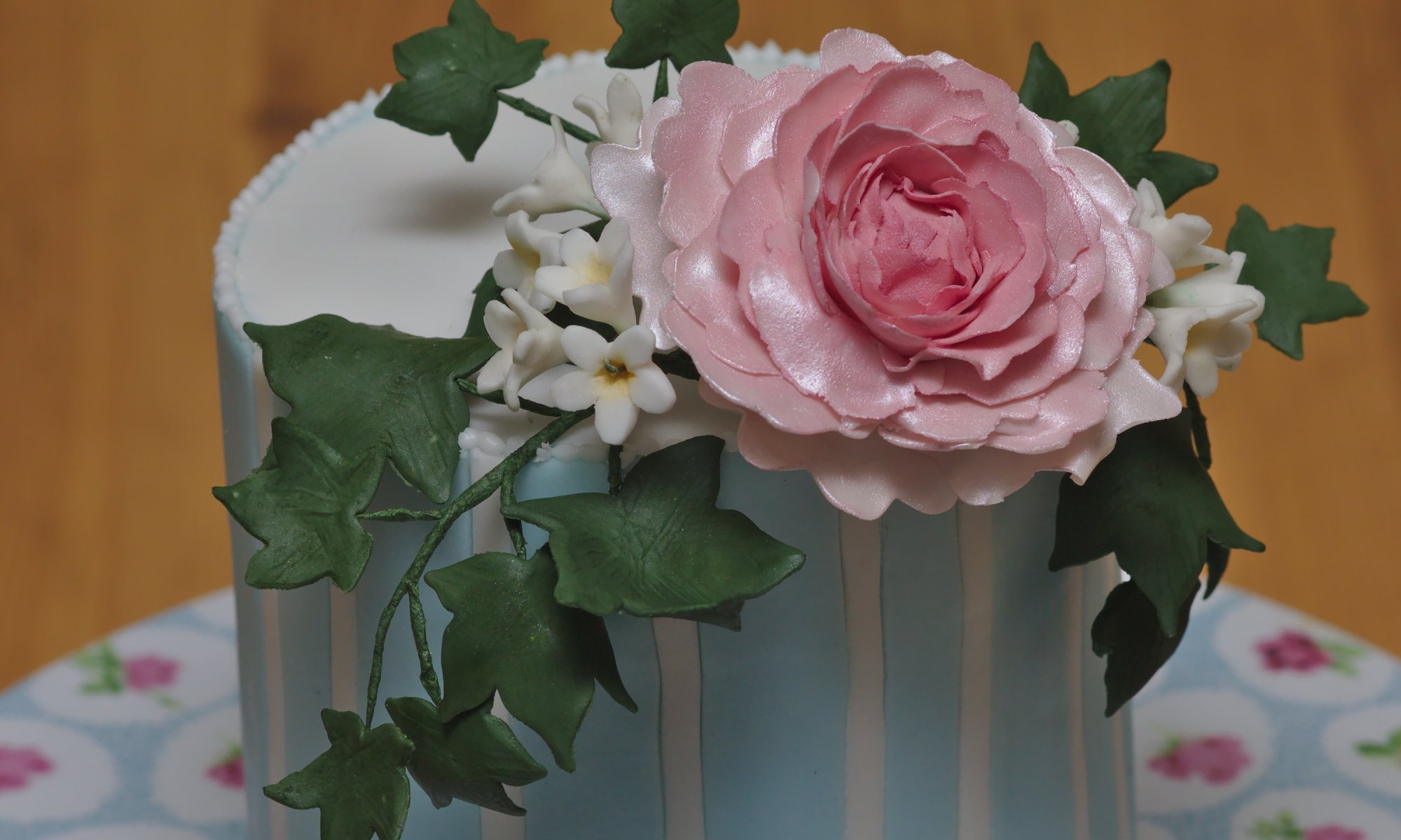 A little cake for Cak’s birthday. Vanilla cake with strawberry and lemon filling. Gumpaste flowers. I tried the wax paper transfer method for the stripes, but it didn’t really work very well. I will need to practise more.