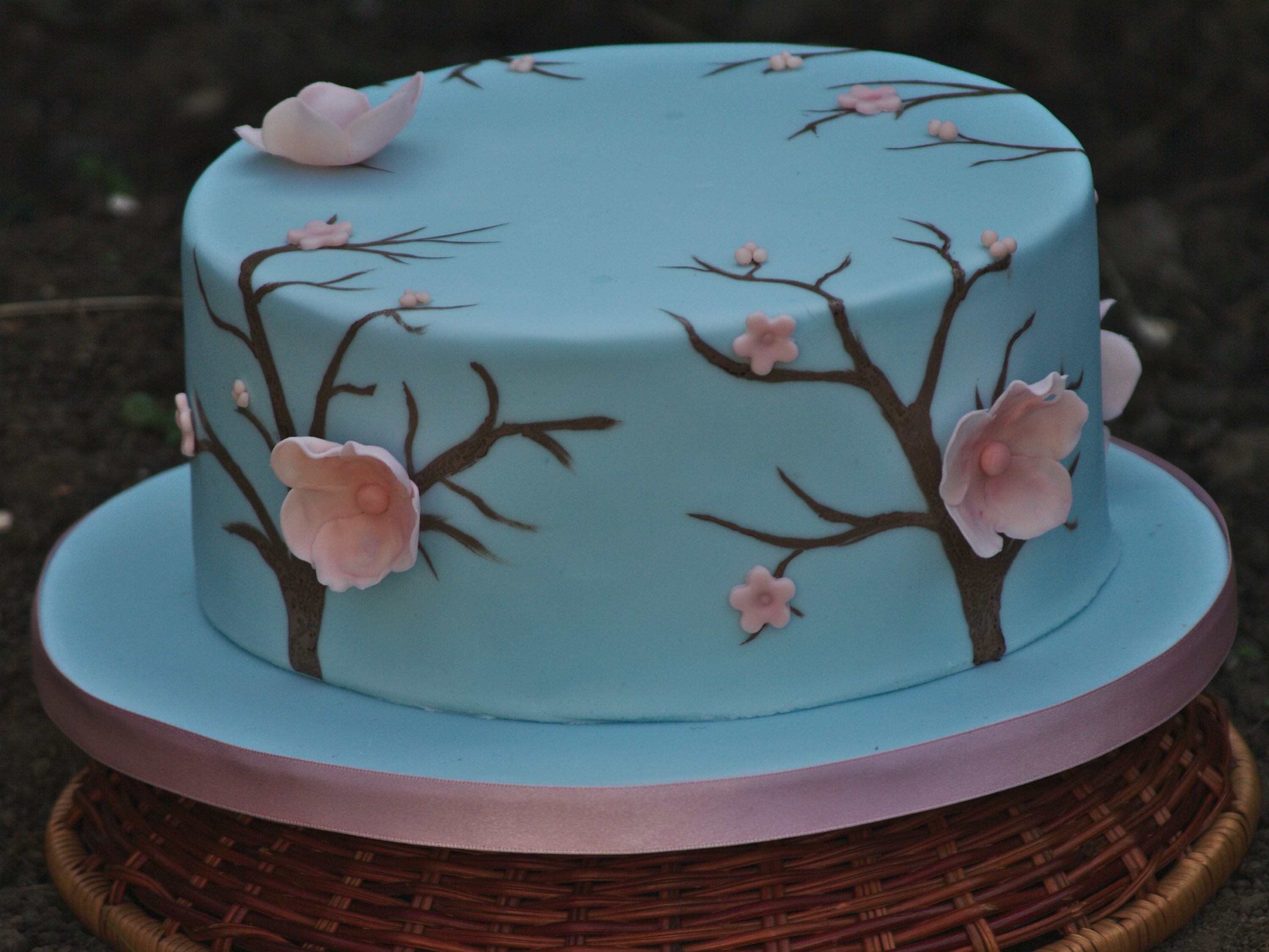 A fruit cake for Meg’s Birthday. Covered in marzipan and sugarpaste with hand-painted branches and sugarpaste flowers.