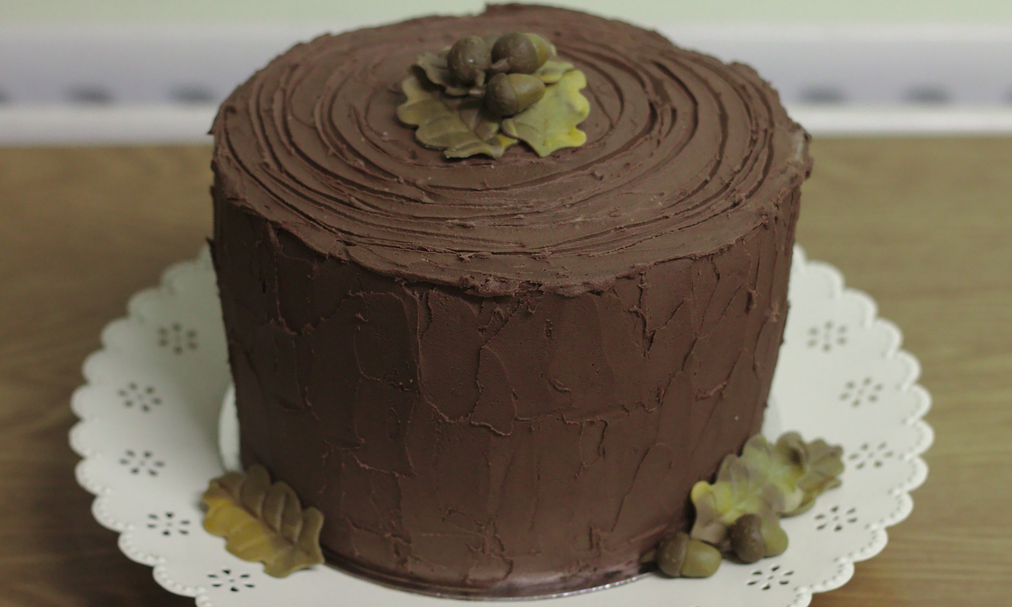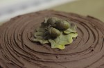 A quick, informal cake. Chocolate cake with chocolate buttercream. Modelling chocolate leaves and hand-modelled acorns.