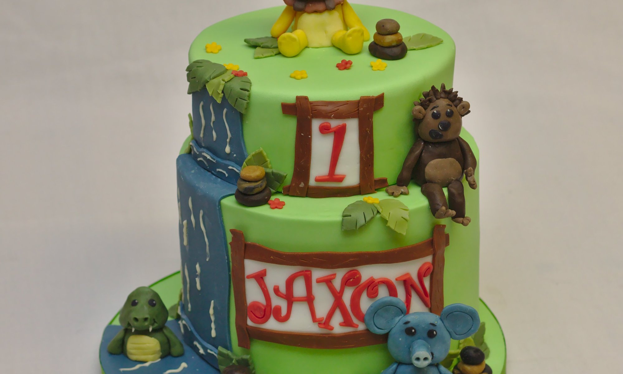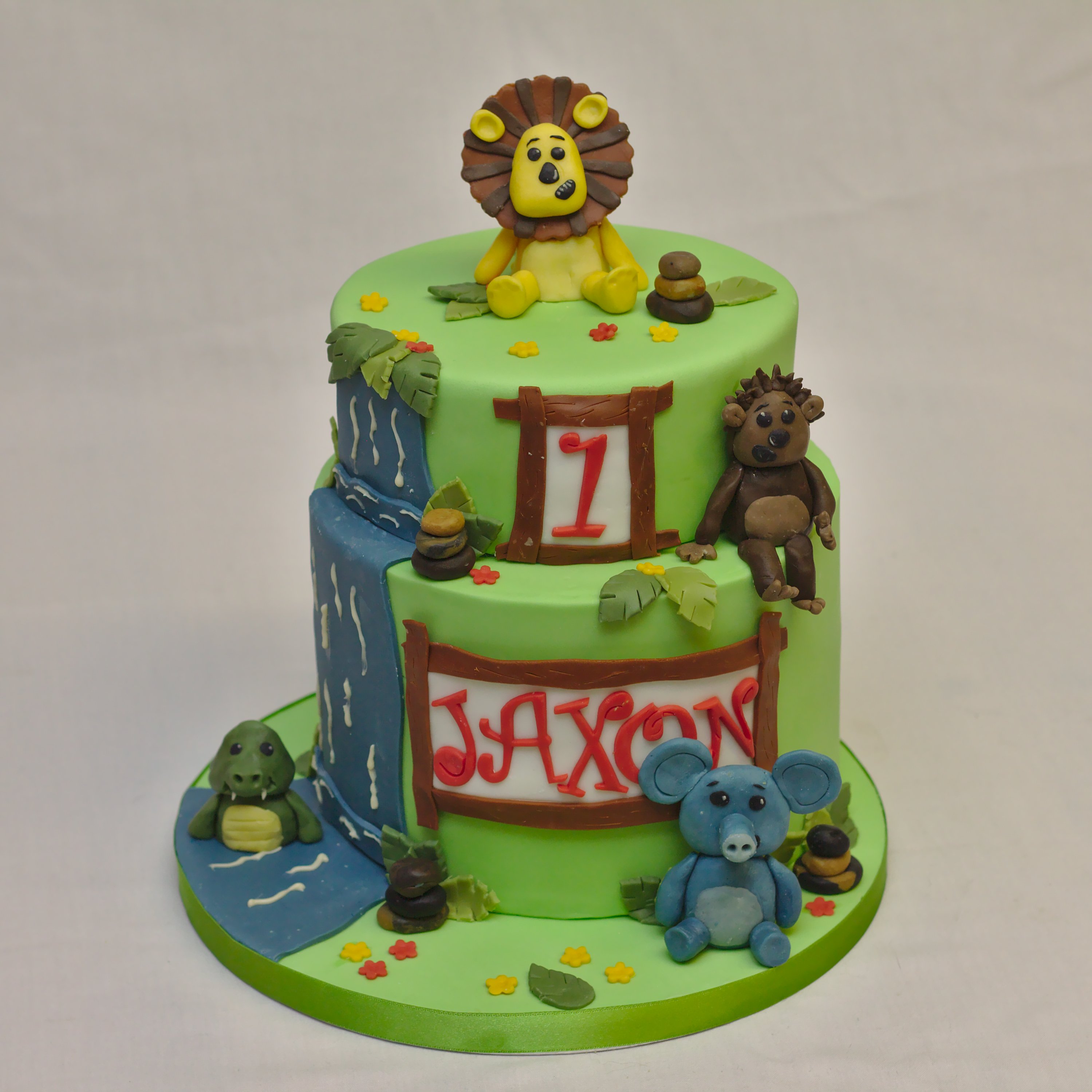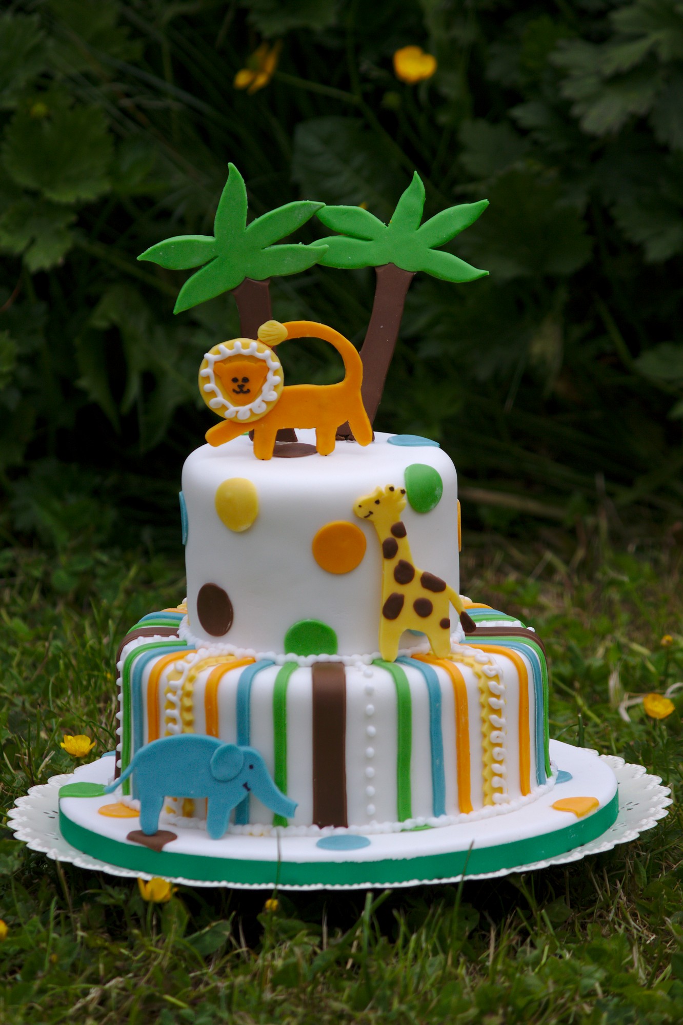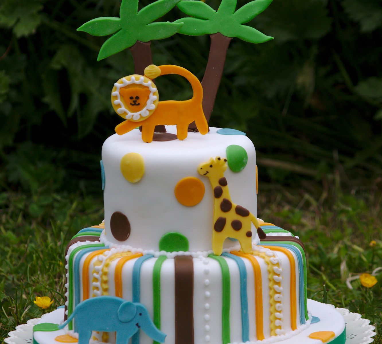 A jungle themed cake for Jacob’s first birthday. Chocolate and vanilla cakes, the coloured decoration was all modelling chocolate – my new favourite decorating medium!