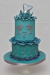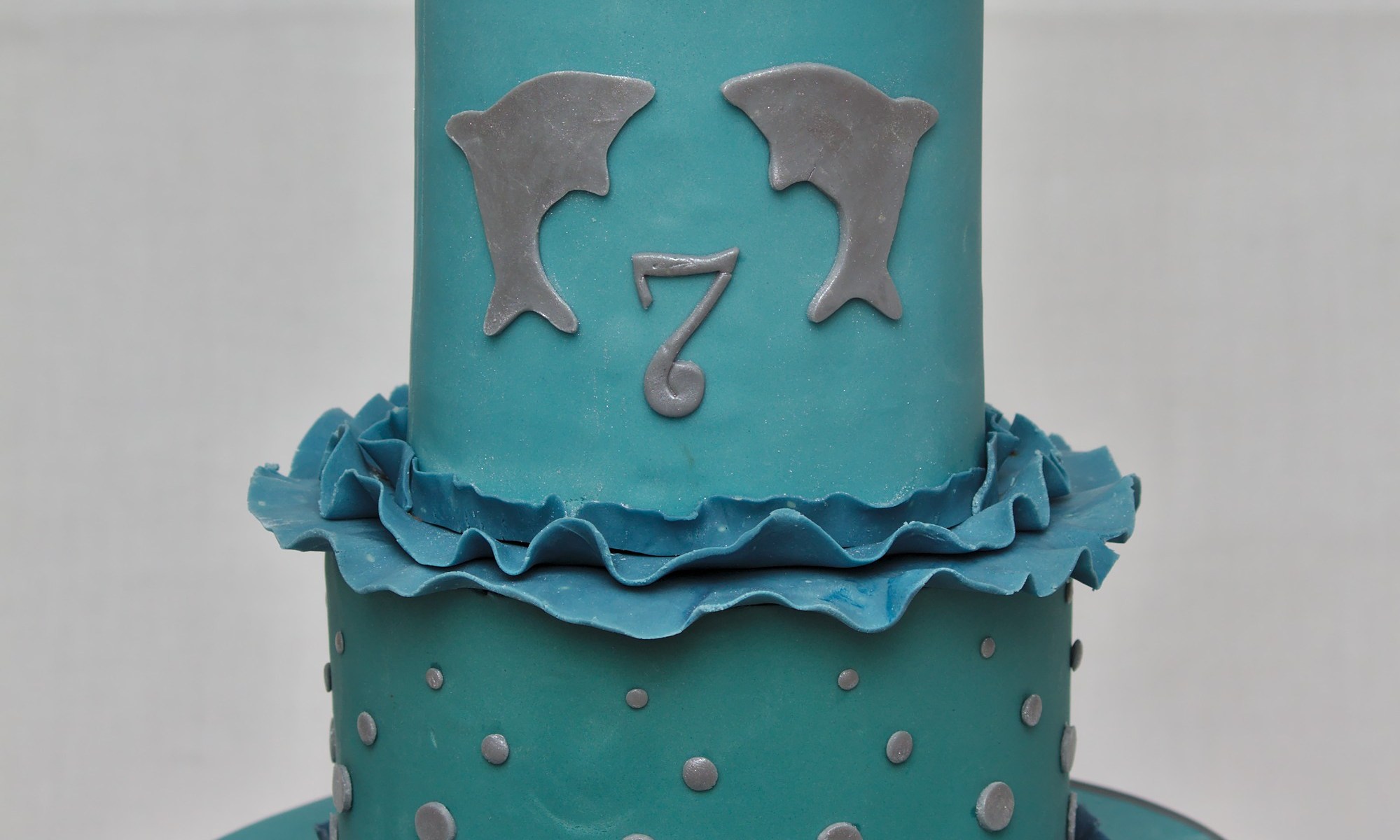 For Rosie’s 7th birthday she requested a cake with dolphins on it. She saw one with the tail coming out of the top, and I had seen a cake with modelling chocolate ruffles between the layers, so we were off! I had intitially thought I would put coral and seaweed round the bottom of the bottom tier, but when she insisted on having the dolphin silhouettes on the top tier, I knew that wouldn’t work and so came up with the simpler, more stylised look of the bubbles. I loved making this cake – she loved eating it! Chocolate and vanilla tiers, covered in sugarpaste with modelling chocolate decorations.