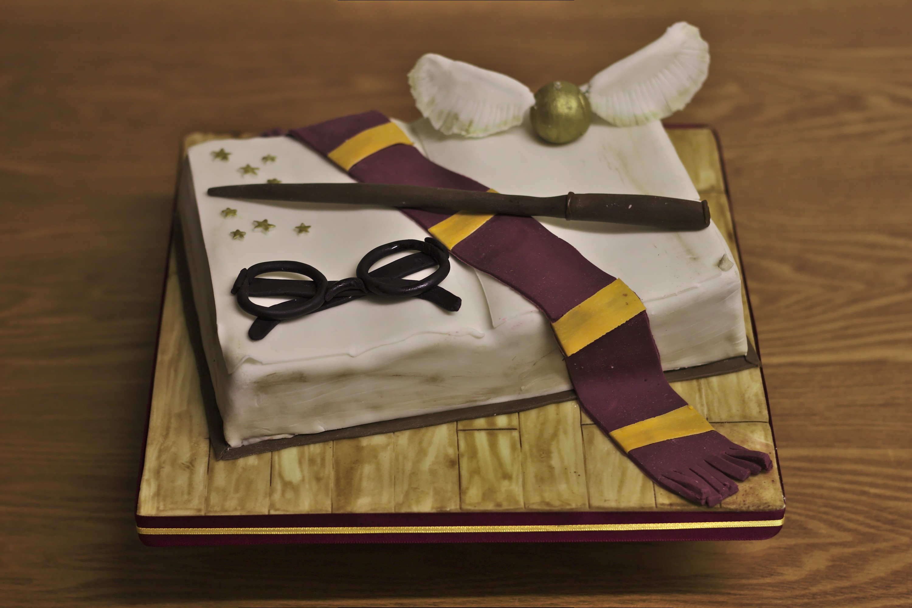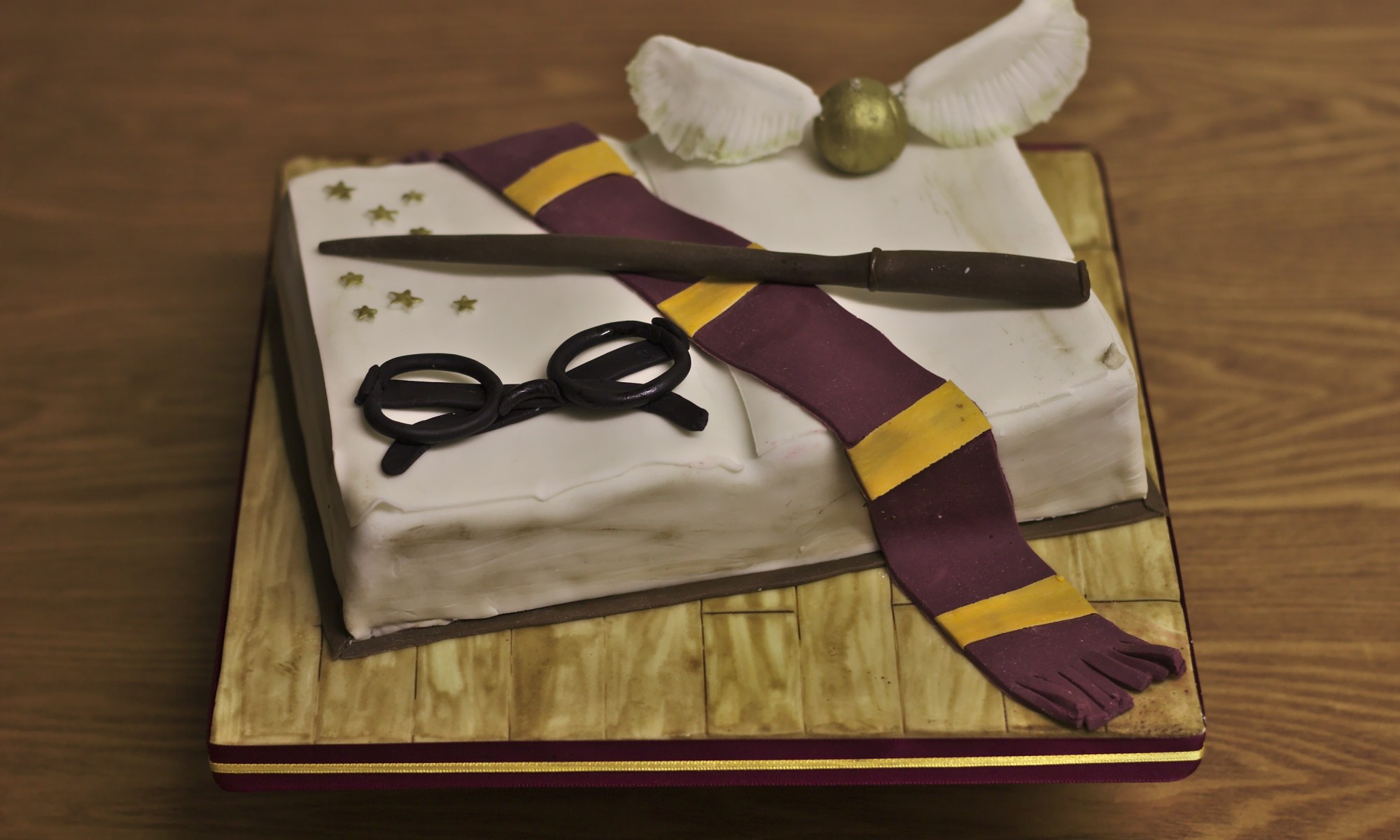 A Harry Potter themed cake. Chocolate cake, covered in dark chocolate ganache and sugarpaste. Modelling chocolate/sugarpaste decorations.