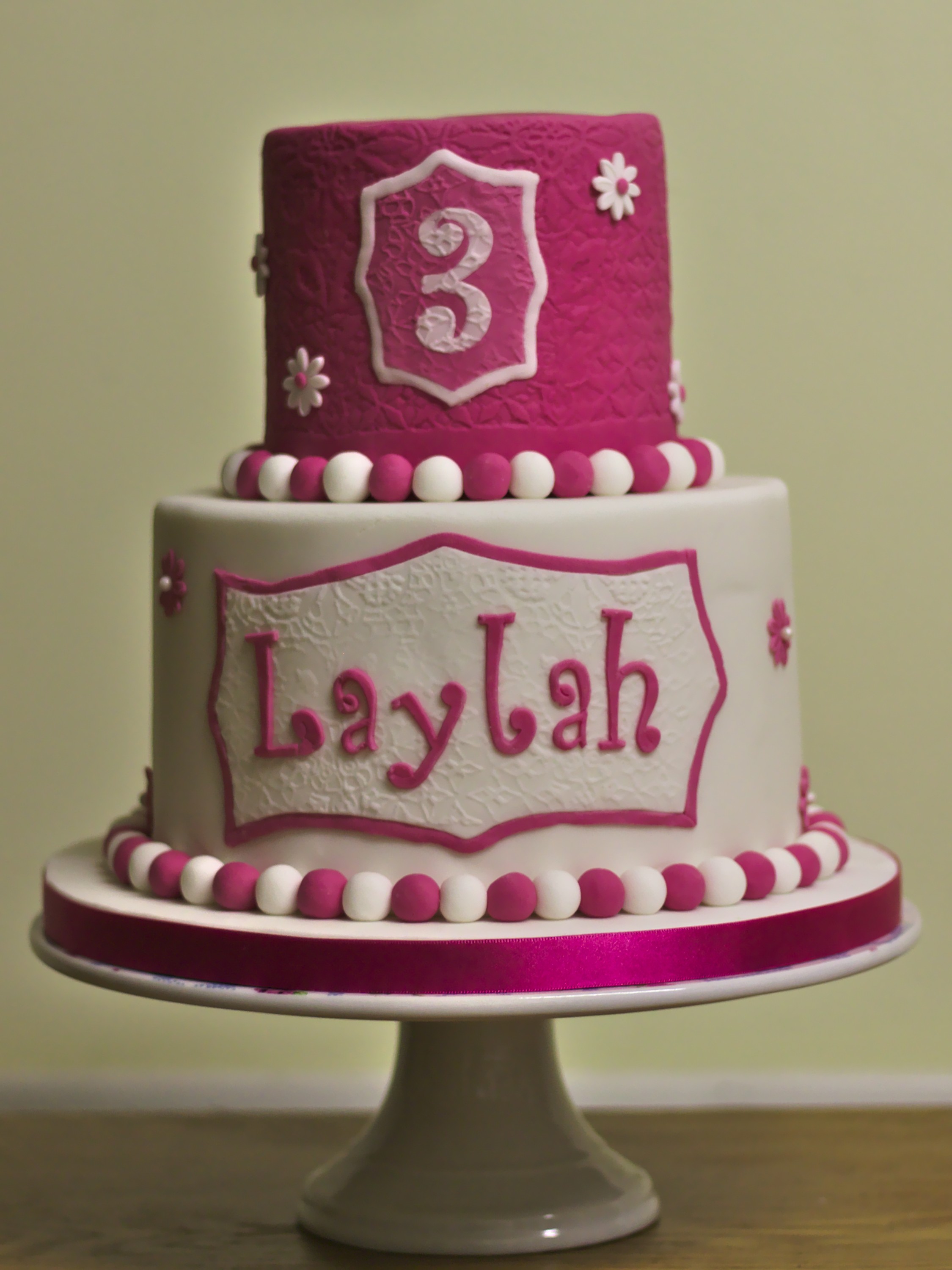 A cake for a friend’s daughter’s 3rd birthday. Chocolate cake filled with with chocolate orange buttercream on the bottom tier and vanilla cake with vanilla buttercream on the top. The “head” was modelled from Rice Krispie Treats. Everything was covered in dark chocolate ganache. I am really becoming a big fan of using ganache as a crumb-coat/undercoat on my cakes. It took a bit of getting used to, but it gives a really good, smooth and firm surface to then cover with sugarpaste. The key is to make sure that the ganache is the right consistency – not too stiff so that it pulls the cake apart, but not so runny that it just slips down the cake. I use two layers of ganache – one to cover the cake and then a runnier one to fill in any slight flaws. The key to getting a smooth finish is to keep at it! Just go round and round again and again until the finish is a smooth as you can get it. There are many great tutorials on how to ganache a cake, so I’ll not go on about it any more. I’ll just finish by saying that it is much easier to put fondant on a cake that has been covered in ganache than one that has been covered in buttercream. It gives you much nicer edges.