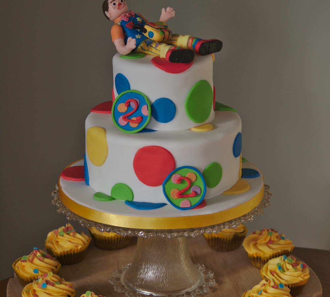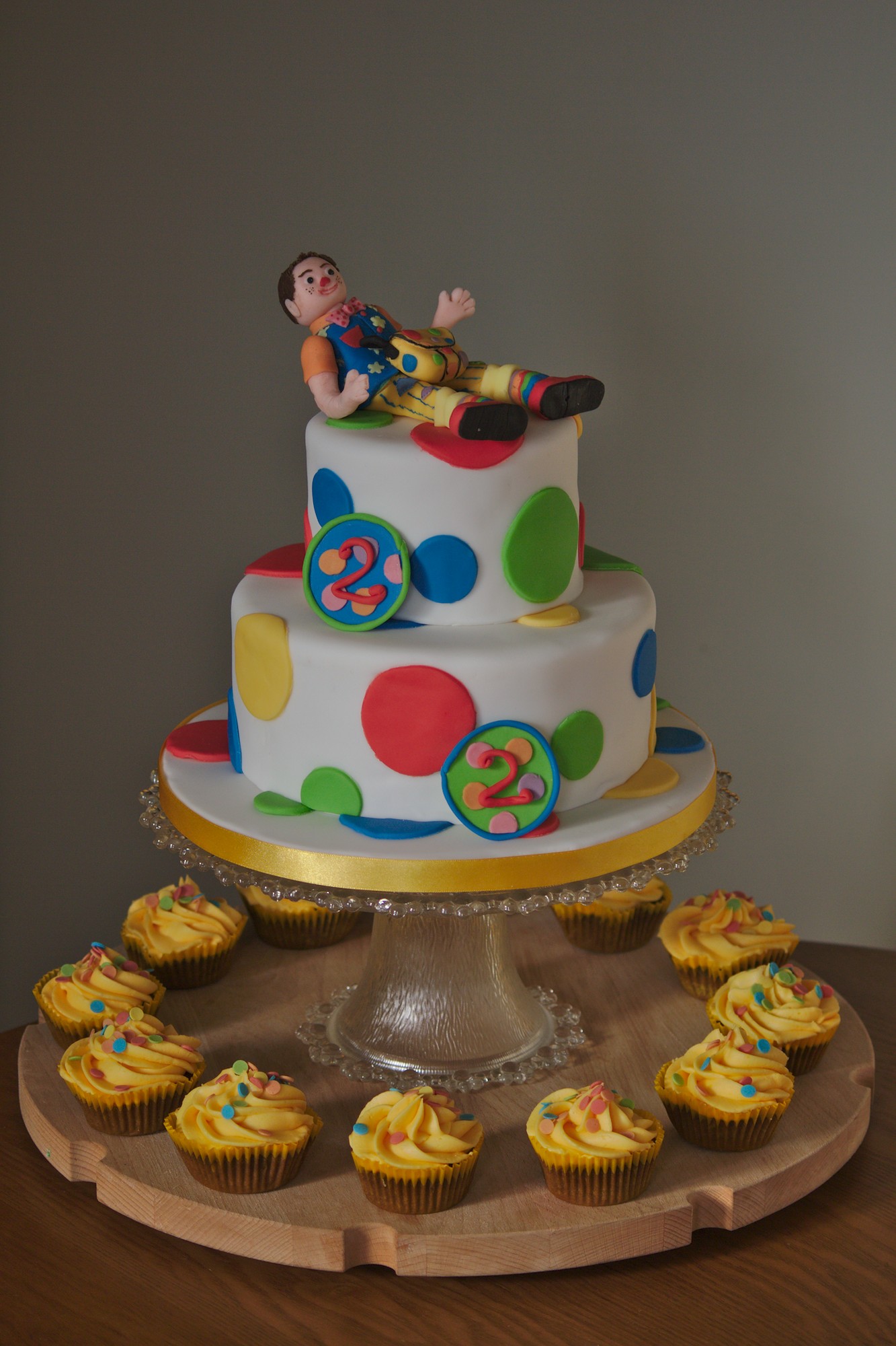 A Mr Tumble themed cake with matching chocolate cupcakes. Bottom tier is chocolate cake filled with chocolate buttercream, top tier is vanilla cake with raspberry and vanilla filling. Mr Tumble is sugarpaste.