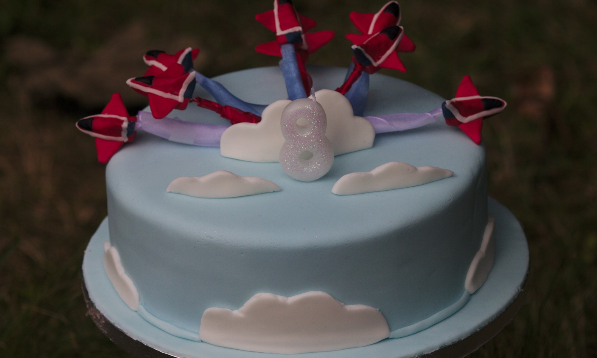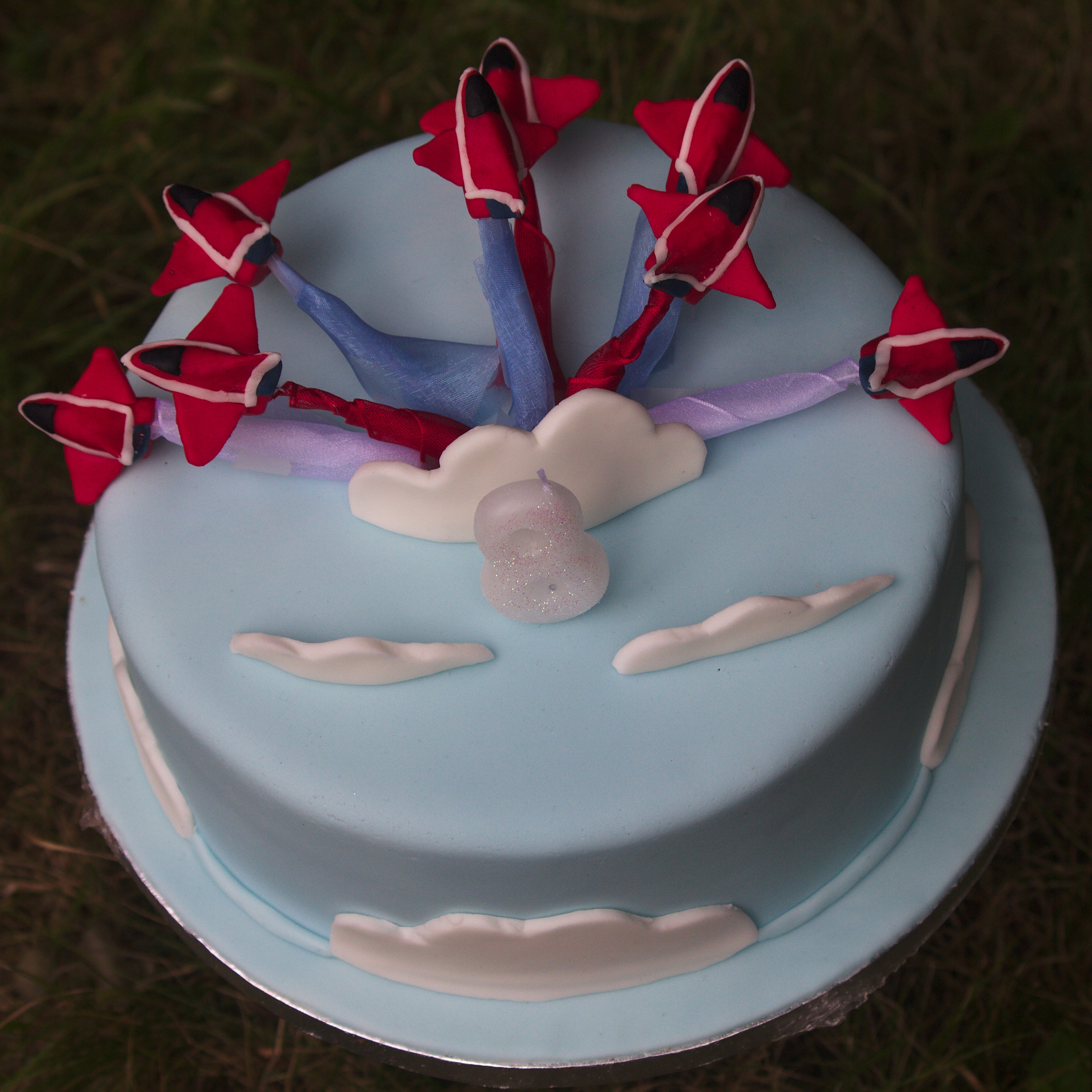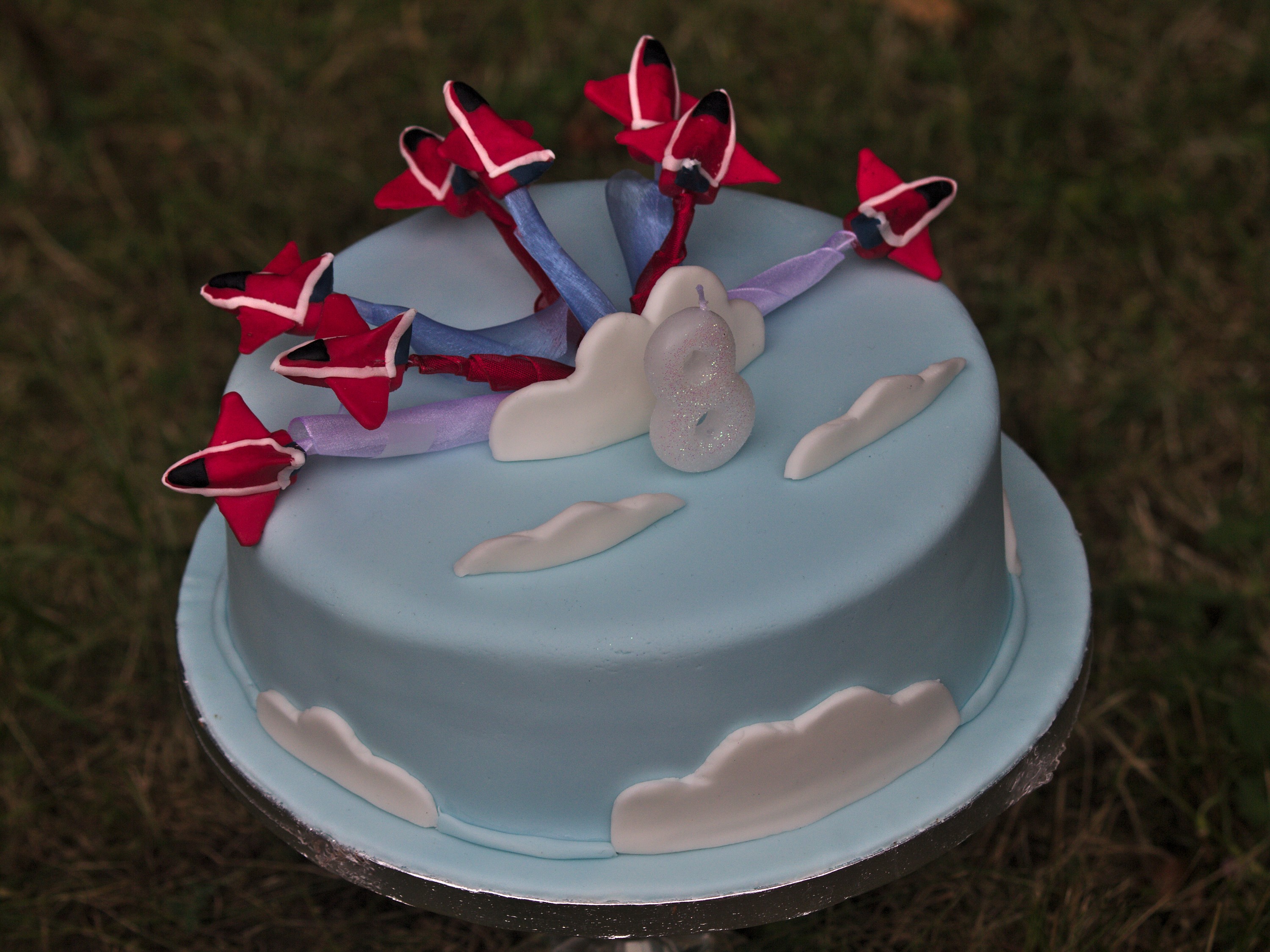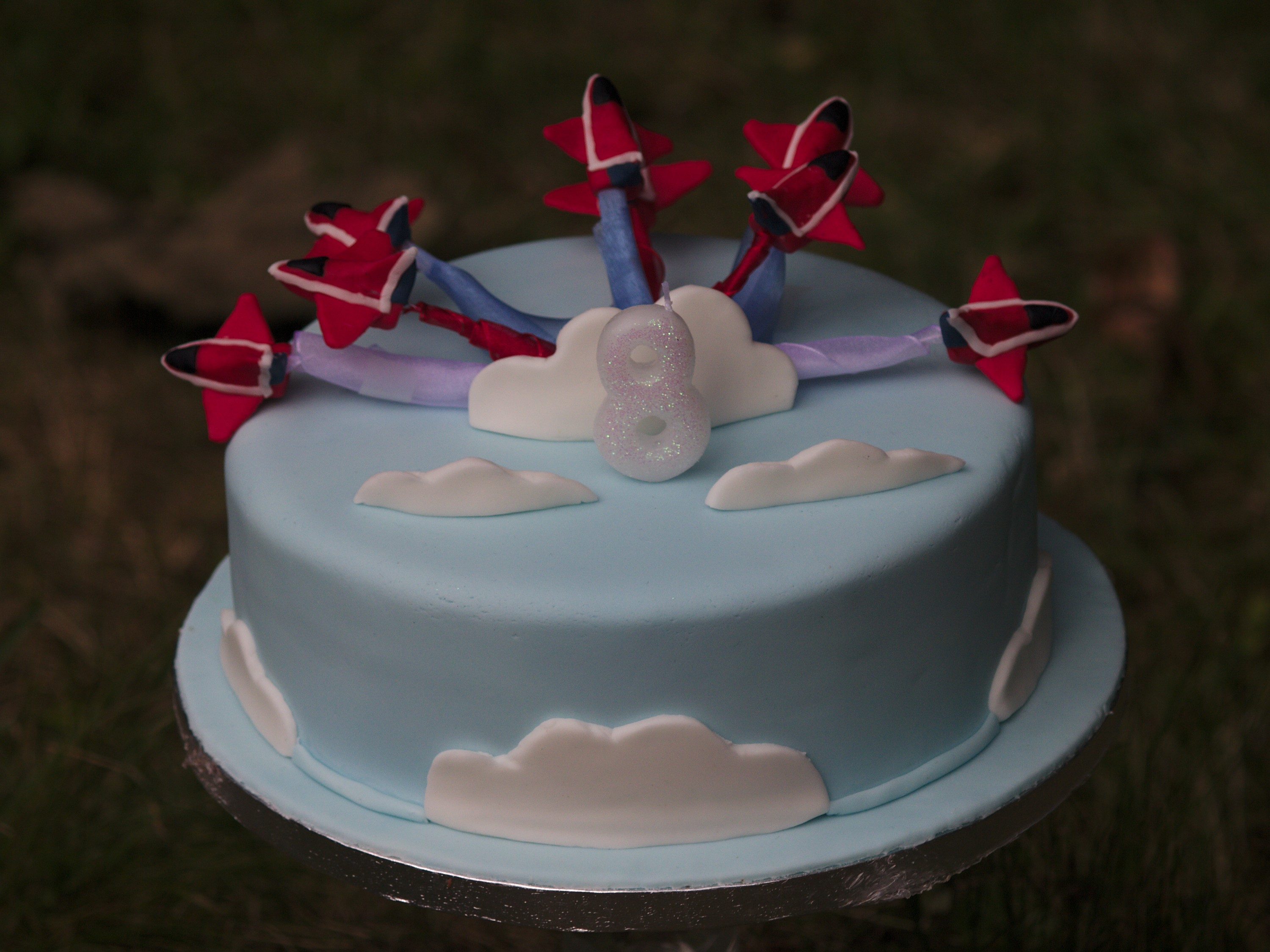 For his birthday Ewan wanted a Red Arrows cake. We were away on holiday so I was limited in what I could do, but I managed to make this for him. Chocolate cake with chocolate buttercream, covered in sugarpaste with modelling chocolate planes.