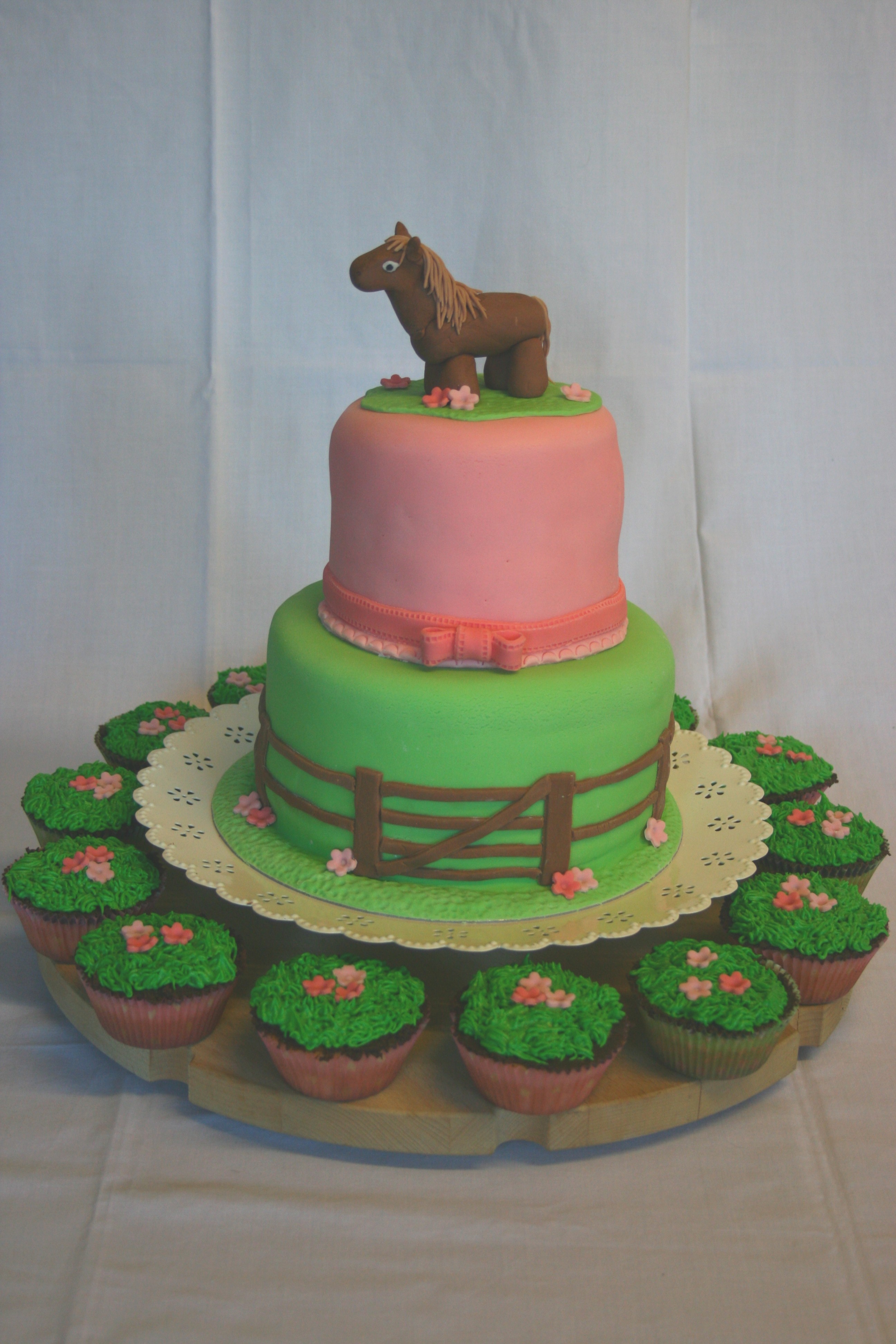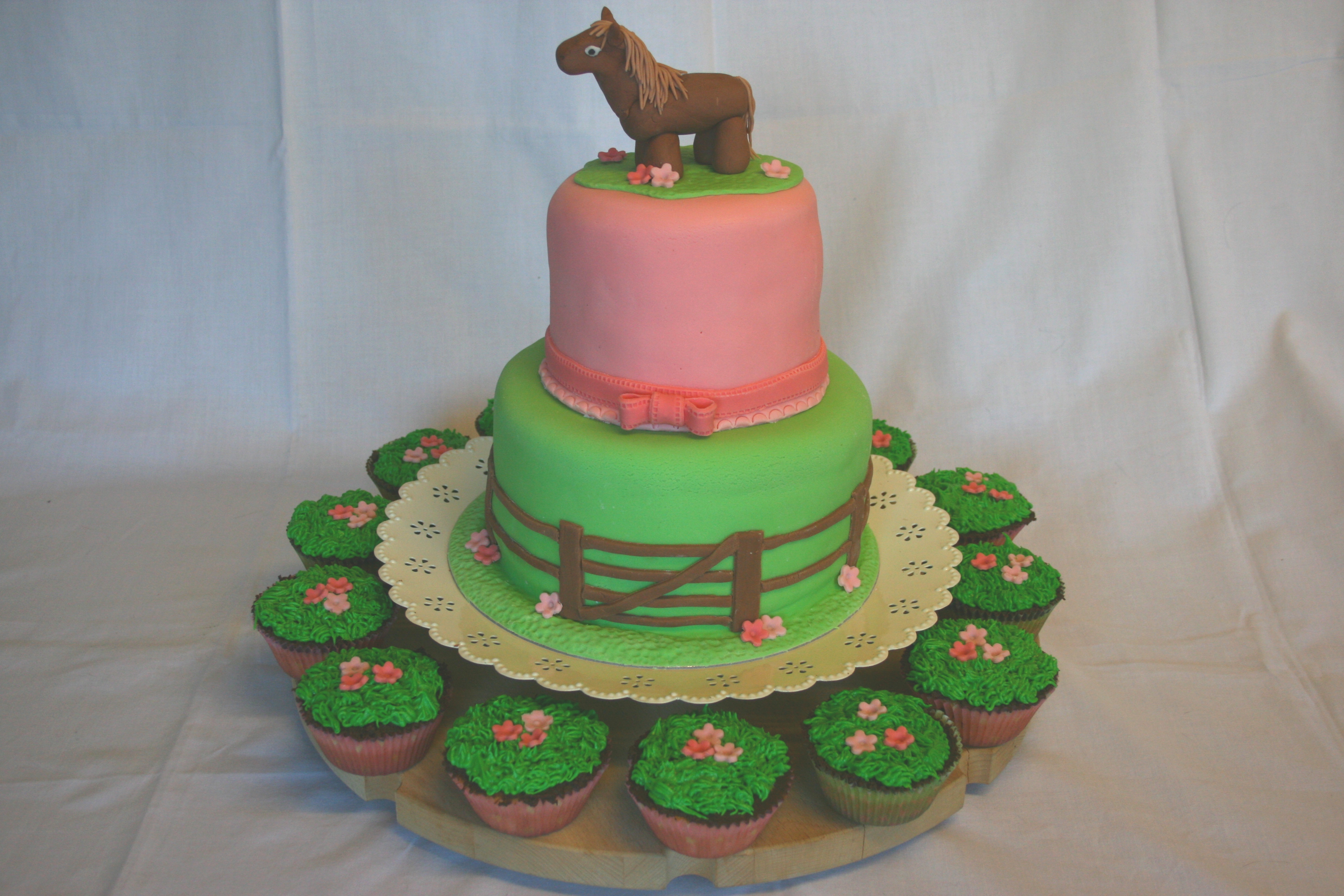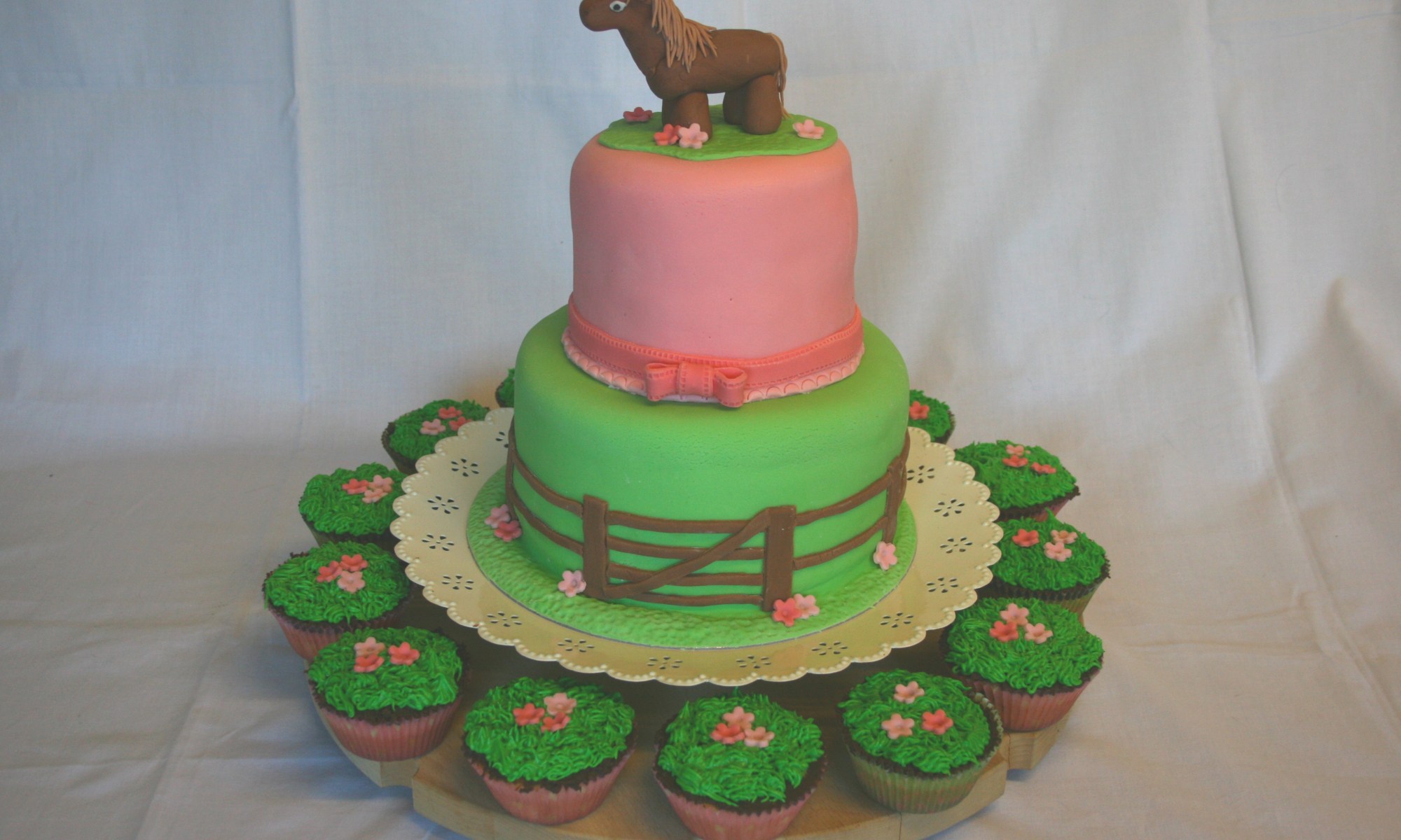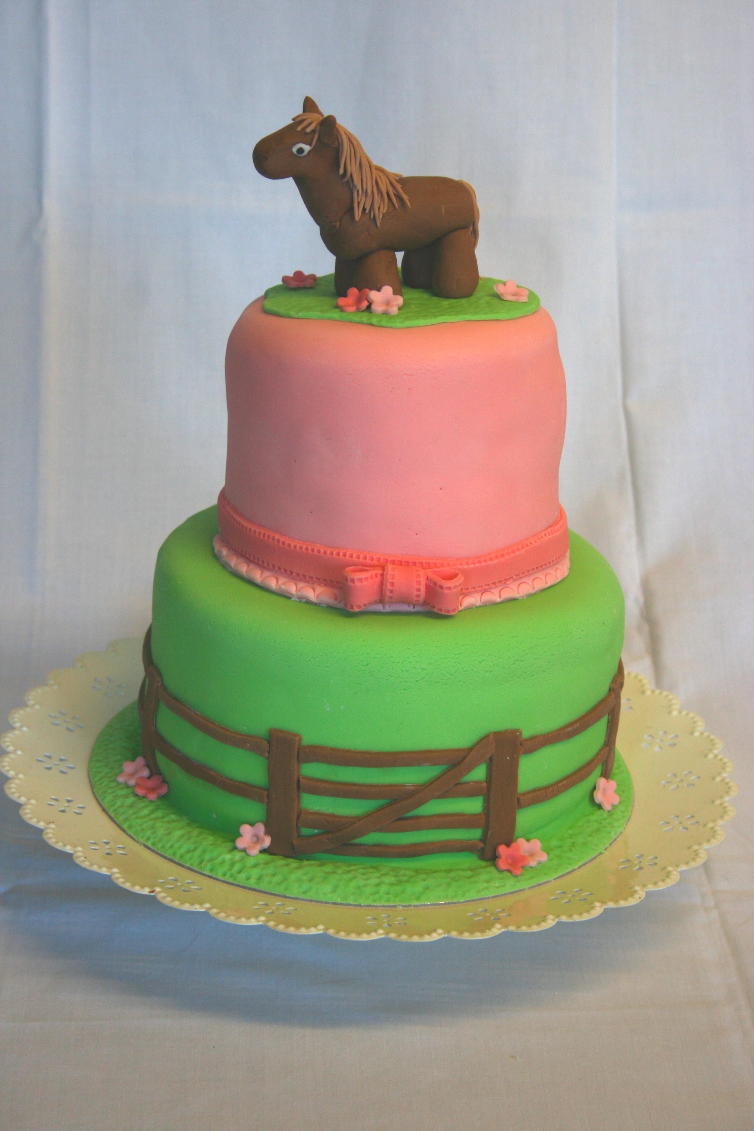 A two tier fondant-covered cake for Kirsty’s 9th Birthday. Bottom tier: chocolate fudge cake with chocolate buttercream filling. Top tier: lemon cake with lemon curd filling and lemon buttercream. Pony topper represents Amber, from Killichronan, Kirsty’s favourite pony in the whole world, and is made from home made marshmallow fondant.