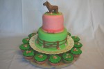 A two tier, 8″ and 6″ vanilla sponge filled with raspberry filling and vanilla buttercream. Lower tier covered in fondant, upper tier with buttercream and sprinkles – lots of sprinkles! Fondant bow to top it all off.