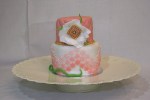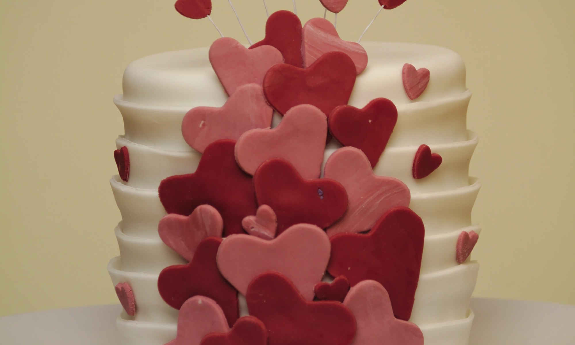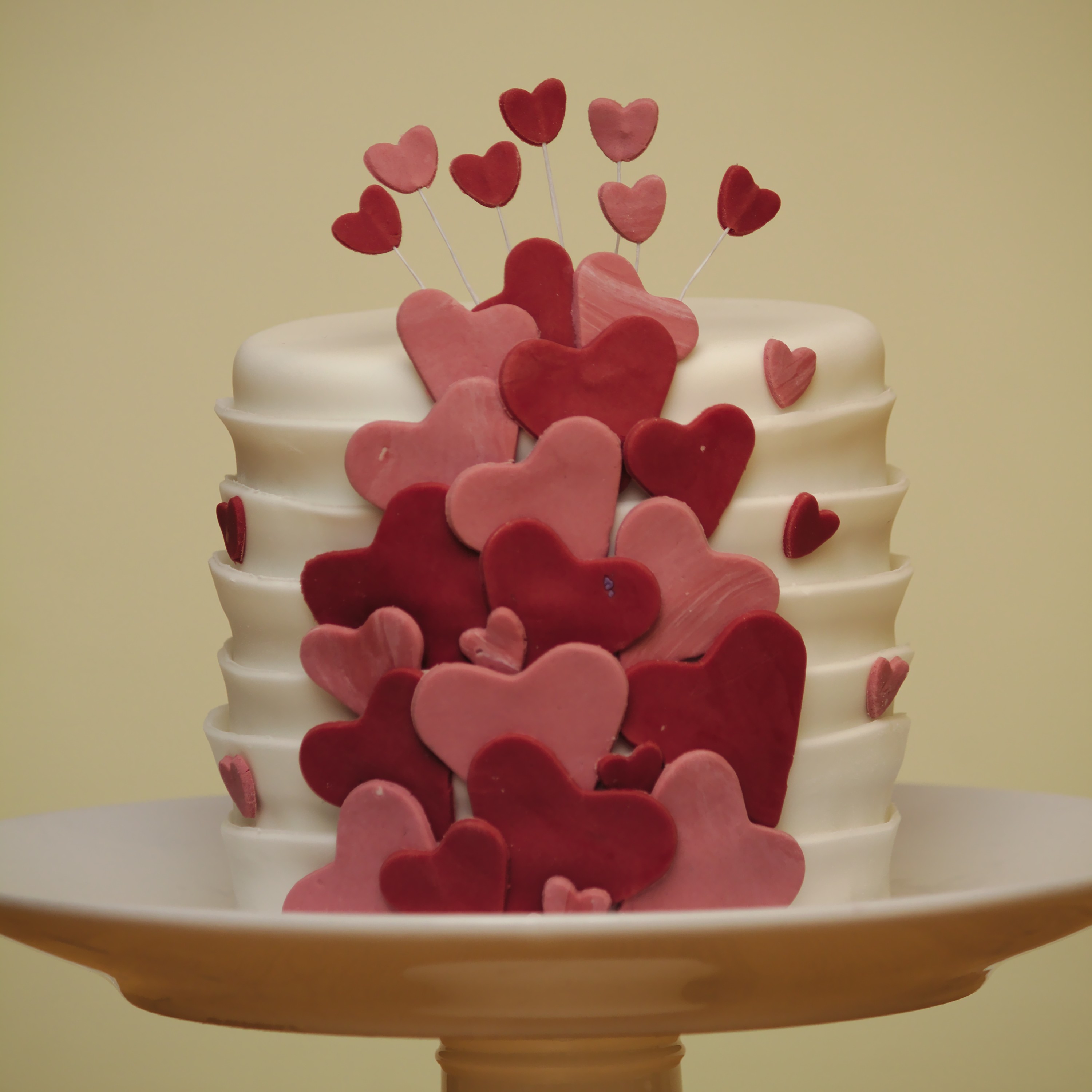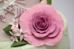 A little 4″ cake I made for Andrew for Valentine’s day. I really liked the effect with the hearts and the sugarpaste layers. I only wish I’d not used up old scraps for the hearts so that they would have looked cleaner – oh, well. Almond rose cake with raspberry curd filling.