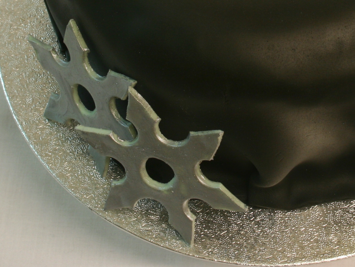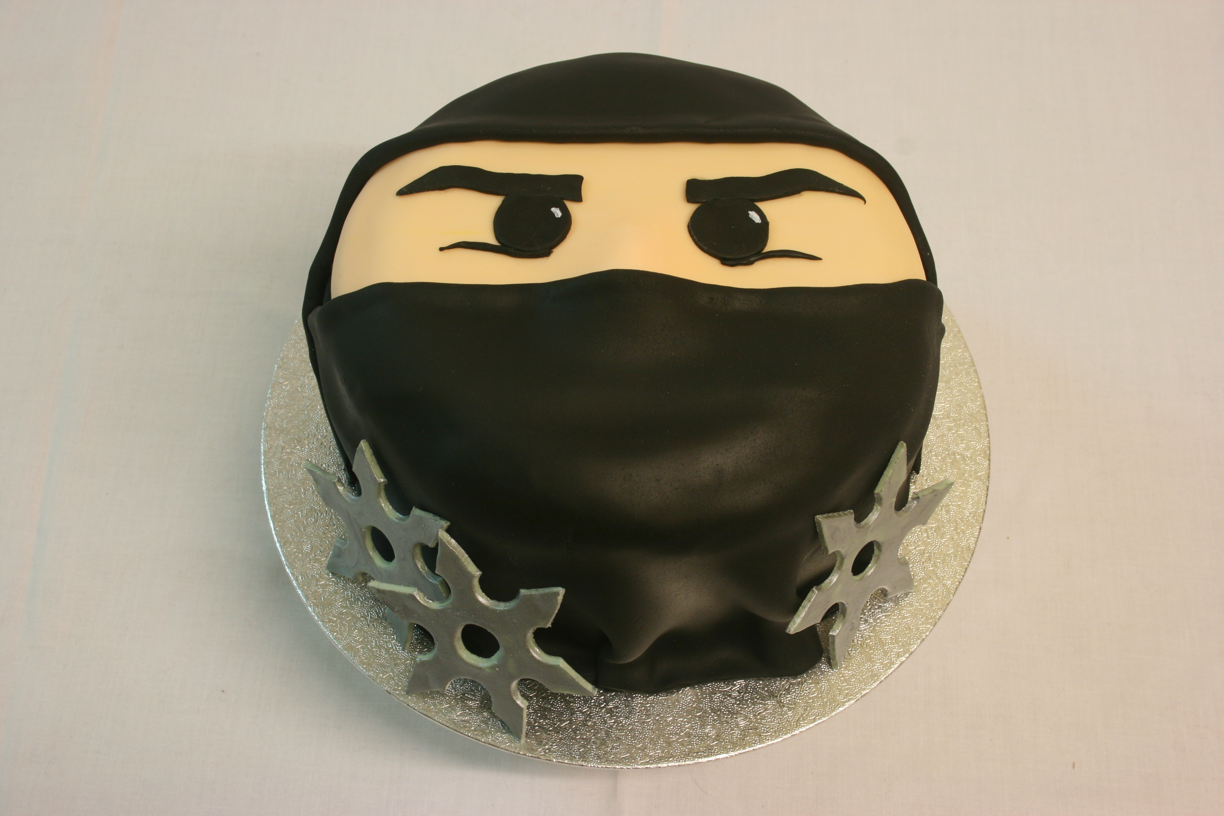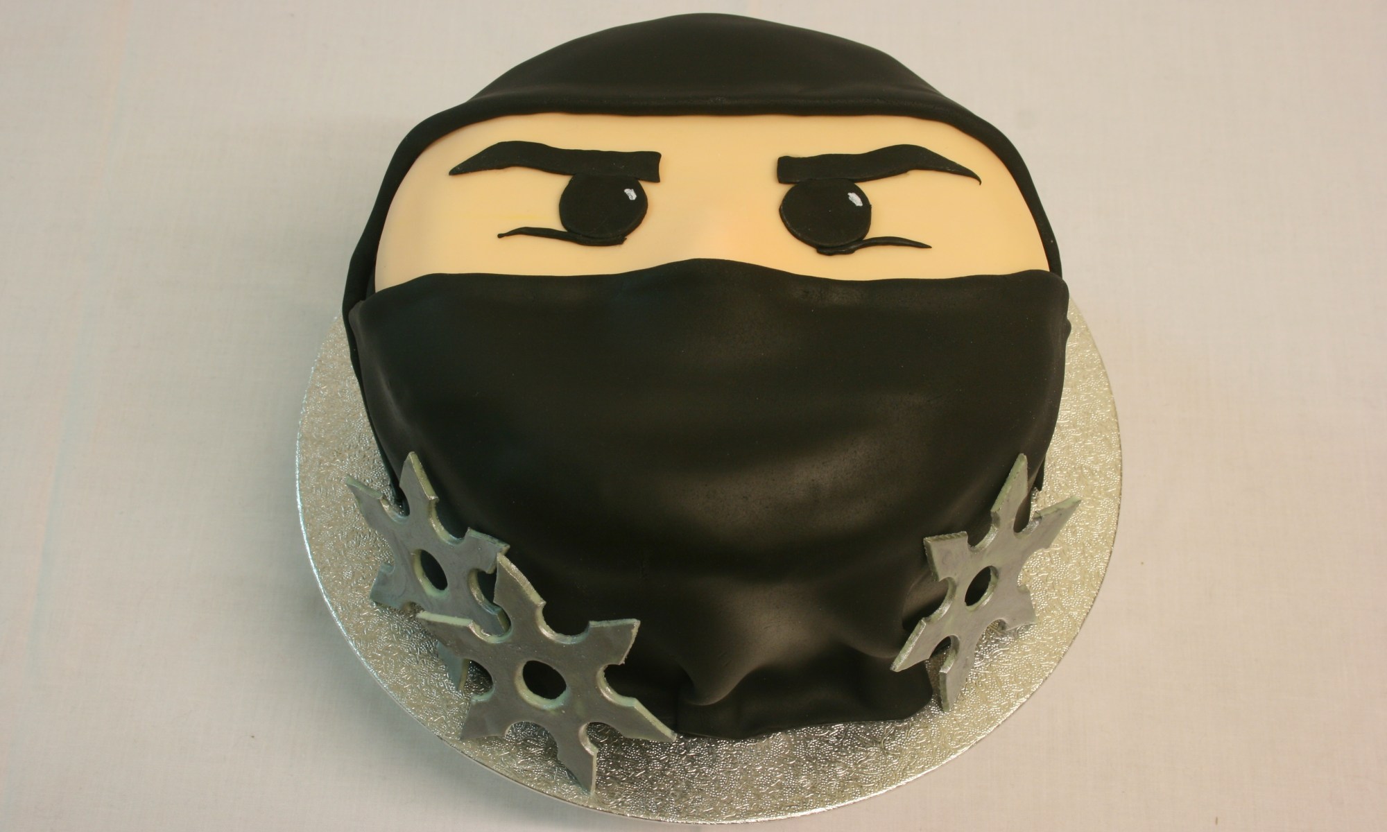 A ninja cake for Debbie. She won the promise of a cake at the fundraising auction, and chose a ninja design for her colleague’s birthday. Chocolate cake filled with chocolate buttercream, covered with fondant and accompanied by sugarpaste throwing stars painted with silver edible paint.
