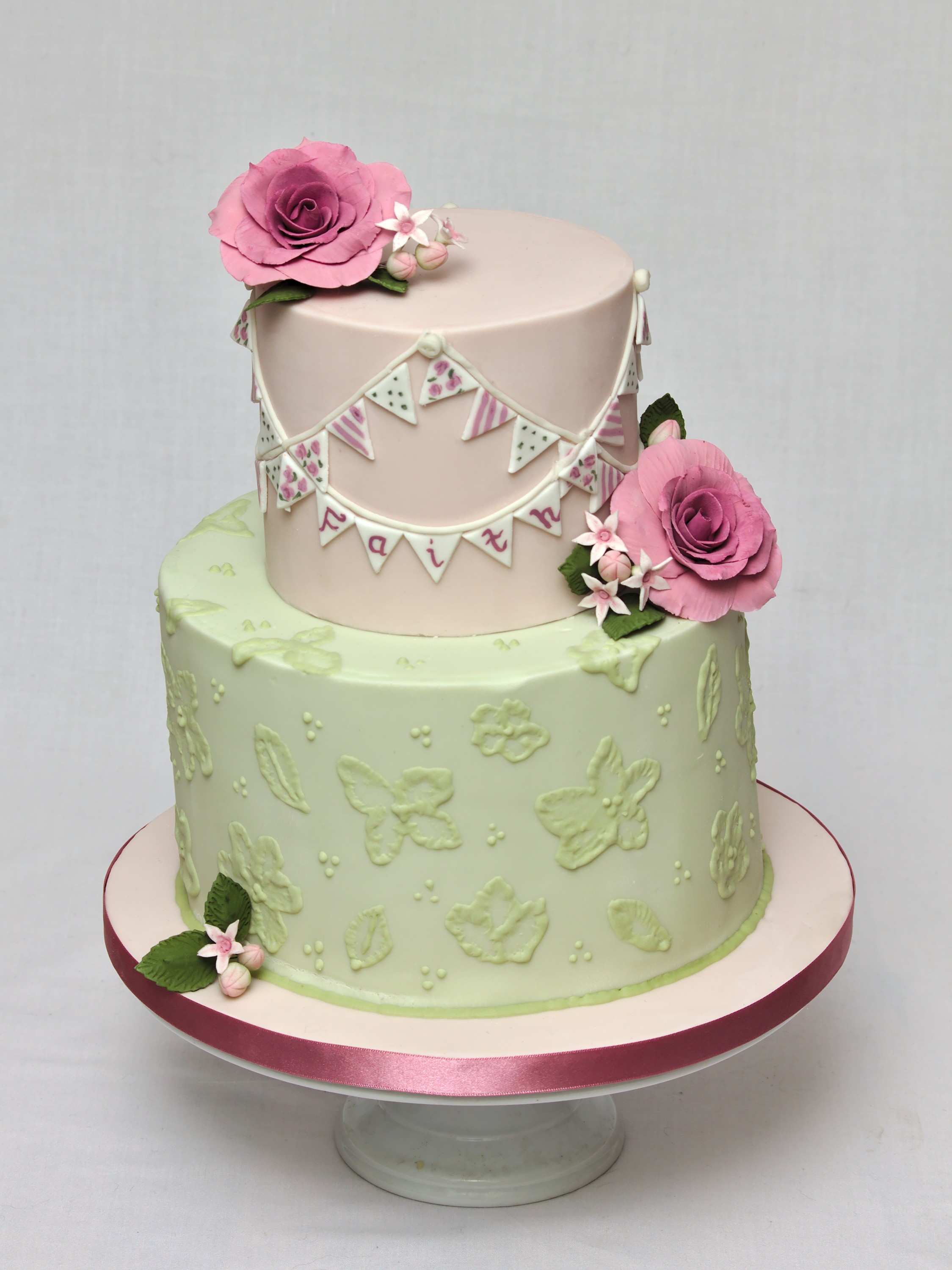 For Faith’s dedication I made a strawberry cake filled with strawberry buttercream. Extended bottom tier with brush embroidery, top tier with sugarpaste bunting. Decorated with gumpaste roses and filler flowers.
