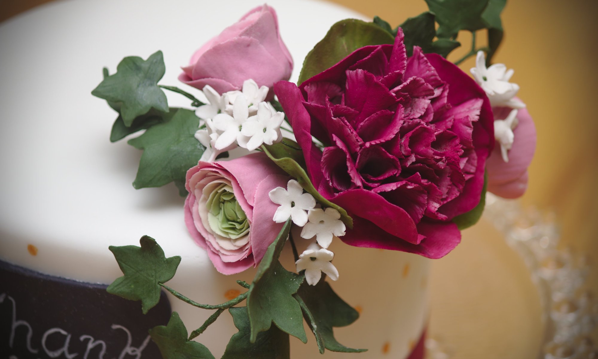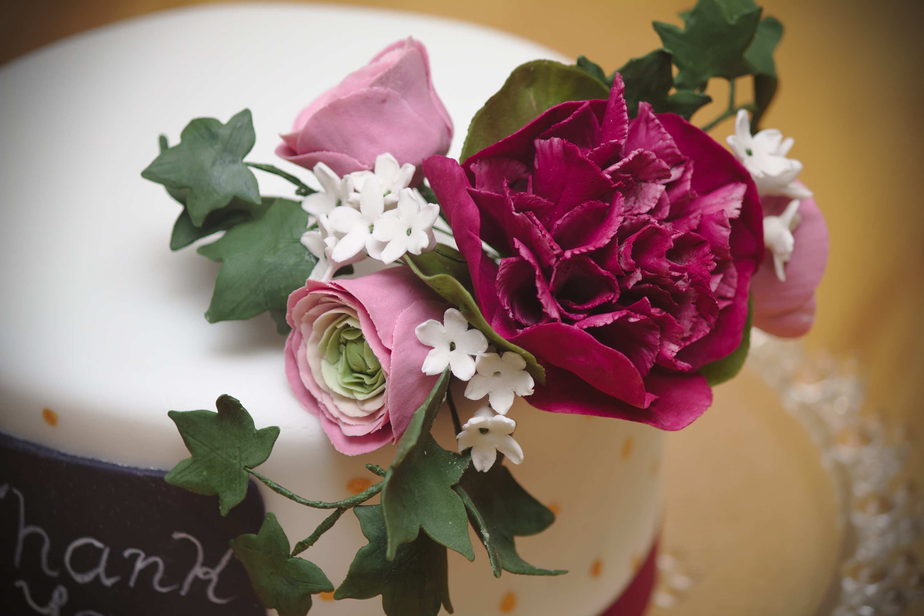 A little chocolate cake with gumpaste double peony, ranunculus, ivy and filler flowers.