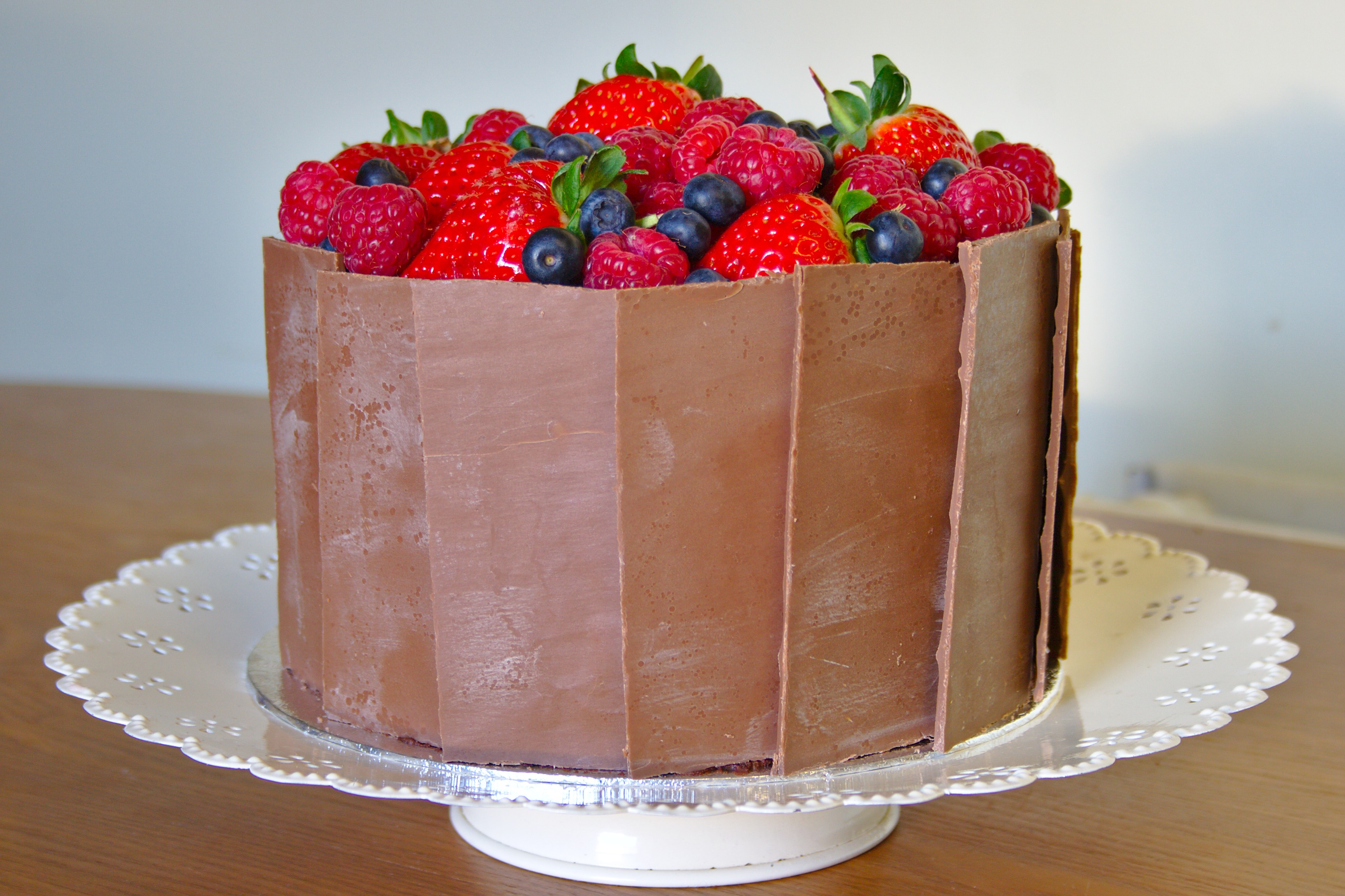 A chocolate cake with chocolate buttercream, panelled with Cadbury’s Dairy Milk Chocolate and topped with fresh berries. This was my first time using chocolate in this way. I had to temper the chocolate to help keep its finish and texture after melting it to shape it for the panels. This was tricky as I discovered my sugar thermometer doesn’t go low enough! I guessed a little but I’m not sure how it affected the finished chocolate. Foolishly, although I knew not to put warm chocolate in the fridge to set (or else it develops a white “bloom”) I didn’t think and put the panelled cake in the fridge to set up a bit before adding the berries. Hence the white marks on the chocolate. I’ll know better for next time!